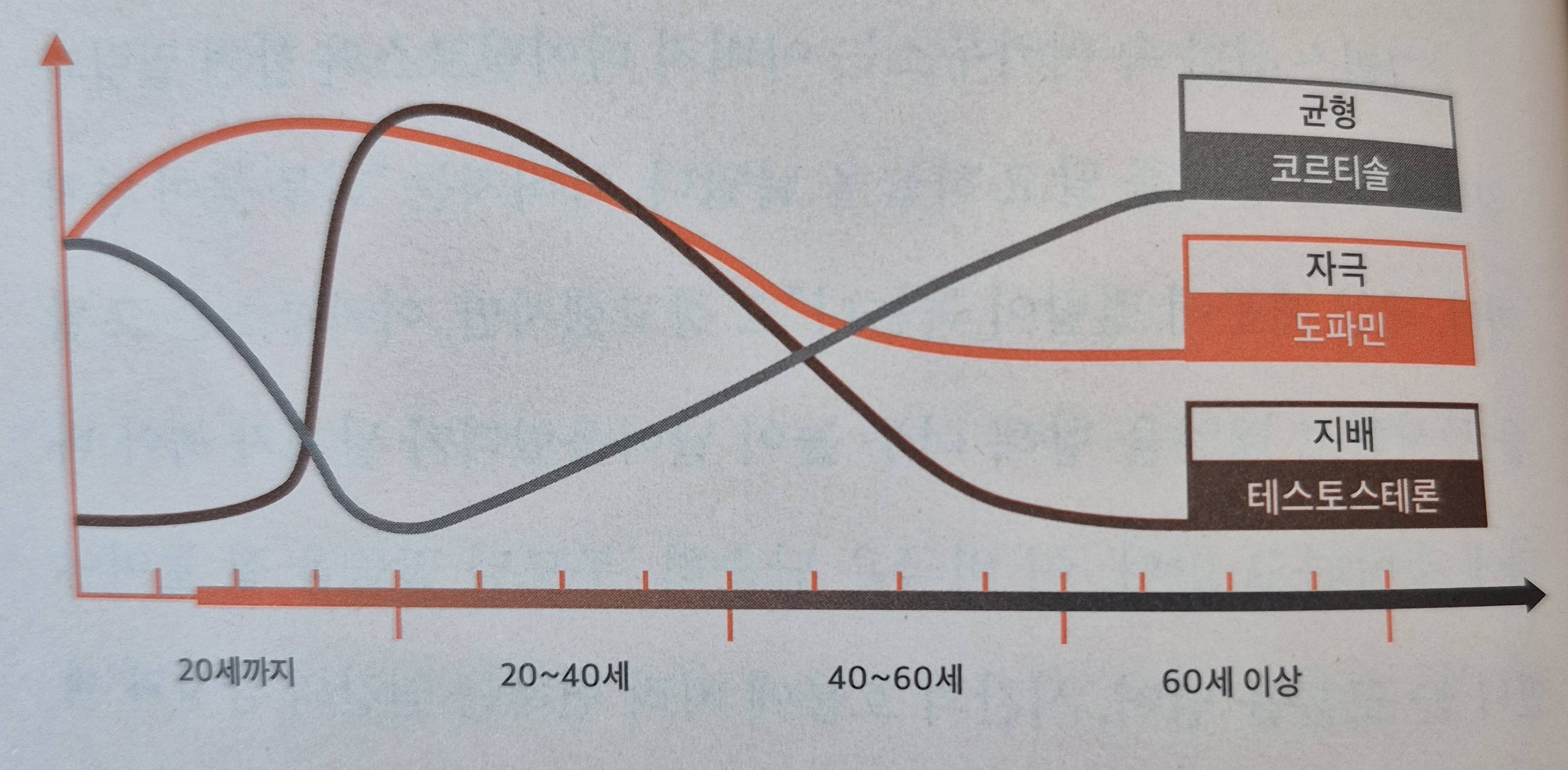 198. 지배와 자극을 이끄는 테스토스테론과 도파민은 20대에 정점을 찍고 점차 감소한다. 이는 어린이와 청소년이 새로운 것에 호기심이 왕성하고 뭐든 직접 해보려고 덤벼드는 반면 나이가 들수록 새로운 것에 대한 관심이나 도전의식이 줄어드는 이유 중 하나다.